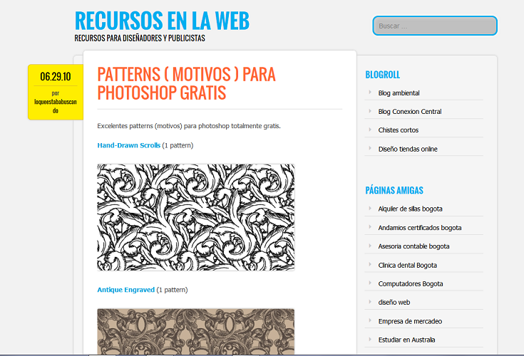 - PATTERNS: Este enlace ofrece patterns o motivos para Photoshop de forma gratuita a través de un listado de imágenes que te llevarán a patternhead.com donde encontrarás el modo de descargarlas y utilizarlas en tu Photoshop. Son muy útiles para ilustradores y publicistas, pero también para cualquiera al que le guste crear. Sirven para hacer portadas, posters, anuncios, etc.