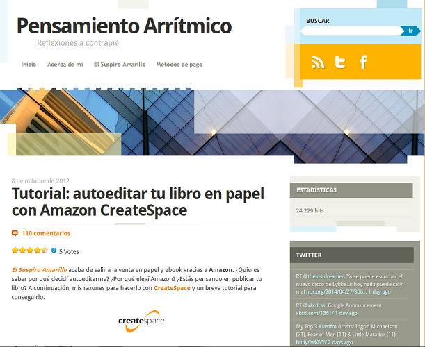 - PUBLICAR EN AMAZON CON CREATE SPACE: En este caso, no es un enlace propiamente dicho. Son dos. Se trata de dos blogs donde sus autores explican cómo publicaron ellos en Amazon mediante Create Space, cómo les fue, los problemas a los que se enfrentaron, etc. Son muy útiles y si estáis interesados en utilizar este método de publicación bajo demanda, os aconsejo que antes leáis estos dos artículos, comentarios incluidos ya que en ellos aparecen muchas de las dudas que se os generarán si os animáis a hacerlo. Los blogs son:
