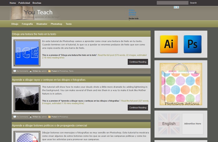 - YOU TEACH: Se trata de una página en la que encontraréis consejos, tutoriales, ejemplos, etc. sobre fotografía, dibujo, ilustración o texto. Tiene muchos apartados interesantes que pueden ayudaros a retocar imágenes, a crear efectos muy chulos para portadas de trabajos o libros, mejorar tipos de letras o a crear vuestros propios botones para una web o un blog.